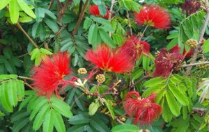 DESCRIÇÃO: A Caliandra é uma planta arbustiva, lenhosa e muito florífera. Apresenta caule ramificado e folhas compostas, bipinadas e opostas, com folíolos pequenos, de cor verde escura. As inflorescências são do tipo umbela, com flores pentâmeras e vermelhas, caracterizadas pelos longos e sedosos estames, que dão ao conjunto da inflorescência um aspecto de pompom. É uma espécie muito ornamental, devido principalmente ao charme de suas flores felpudas. Ela é excelente para formar cercas vivas topiadas ou renques informais. Também pode ser plantada isolada, criando um certo destaque ao jardim quando está florida.